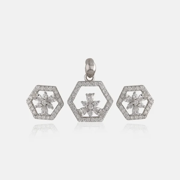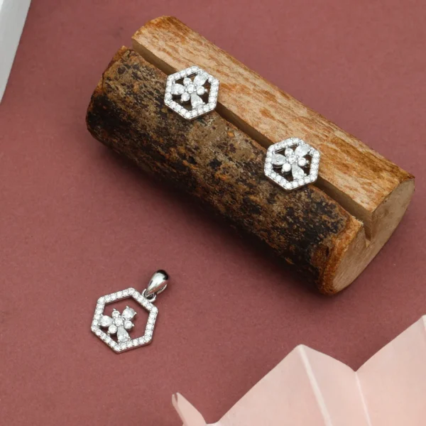 925 Sterling Silver Pendant & Earing With Geomatric white stone Flower Design For Womens