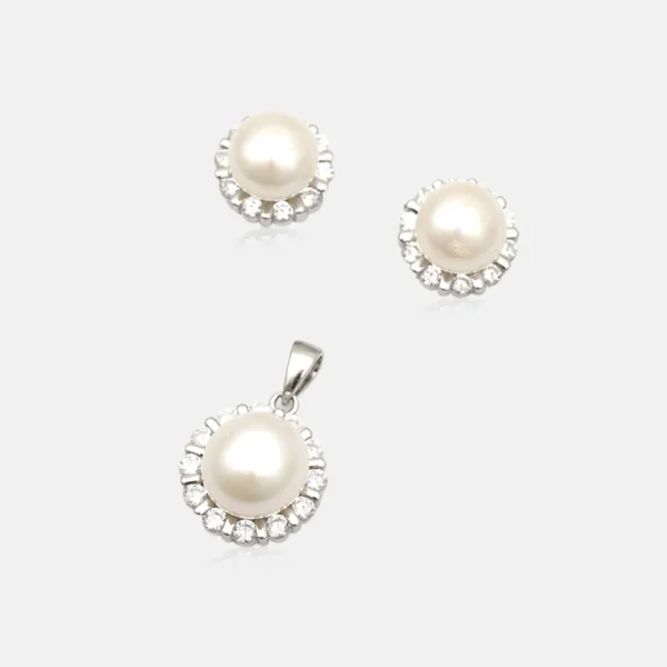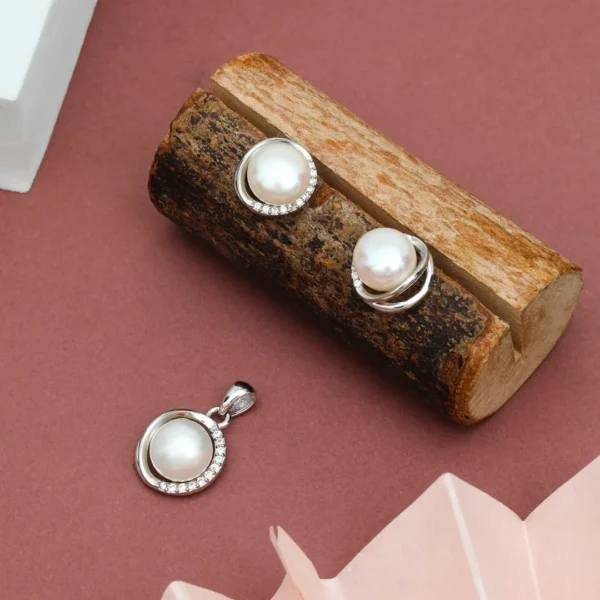 Pure Silver 925 Fresh Water Pearl & Circle Stones Pendant With Earring For Women’s