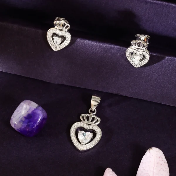 925 Sterling Silver Pendant & Earing With Heart And Crown Design For Womens