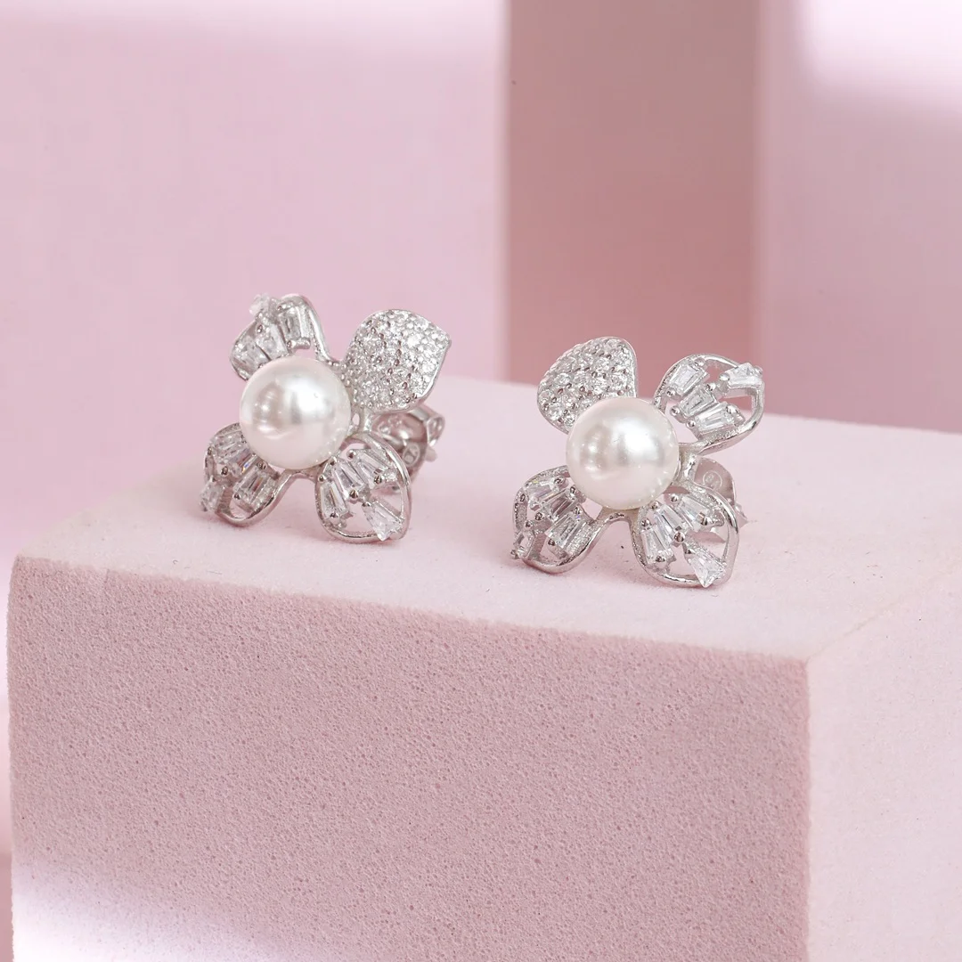 925 Sterling Silver Earings With Pearl & Floral Design For Womens