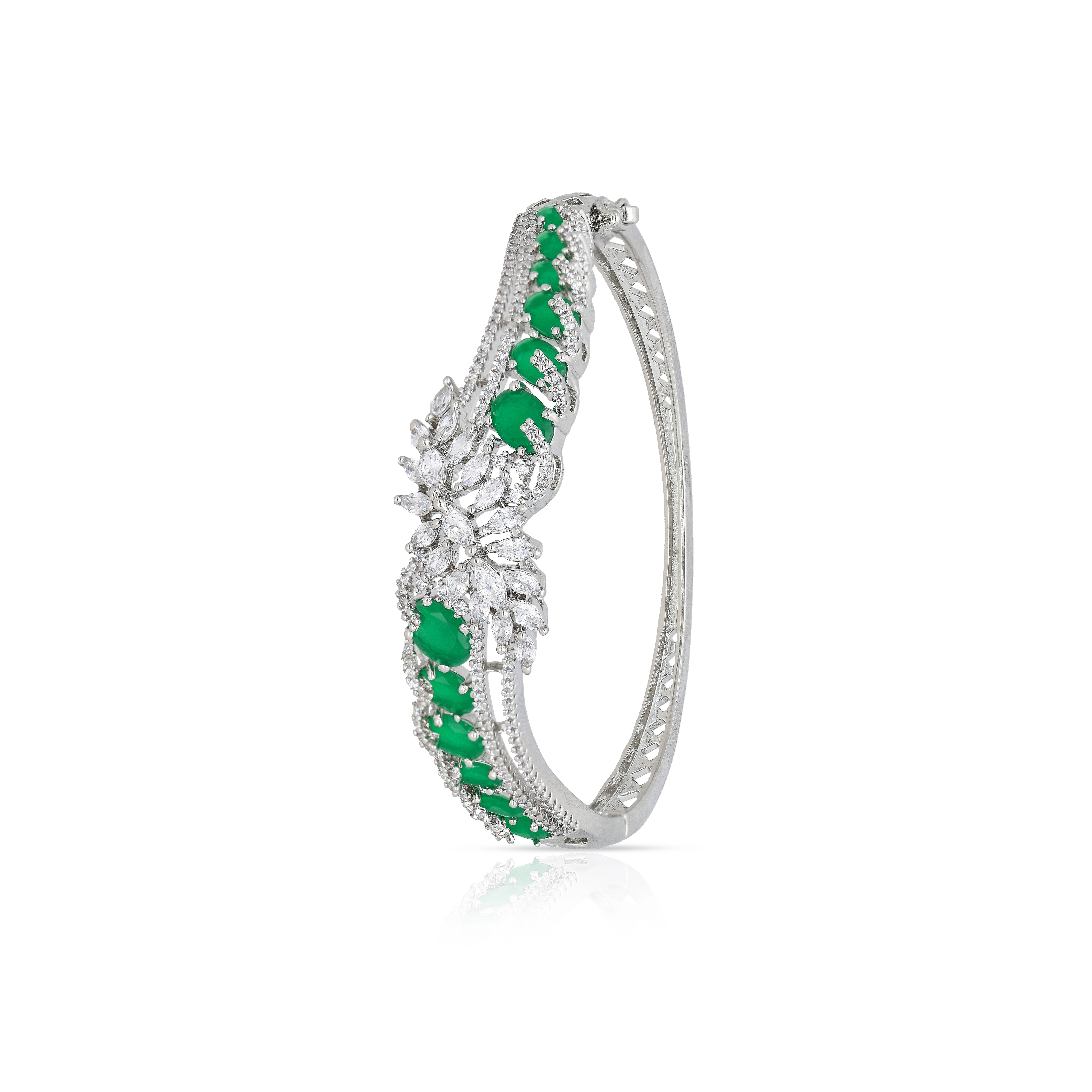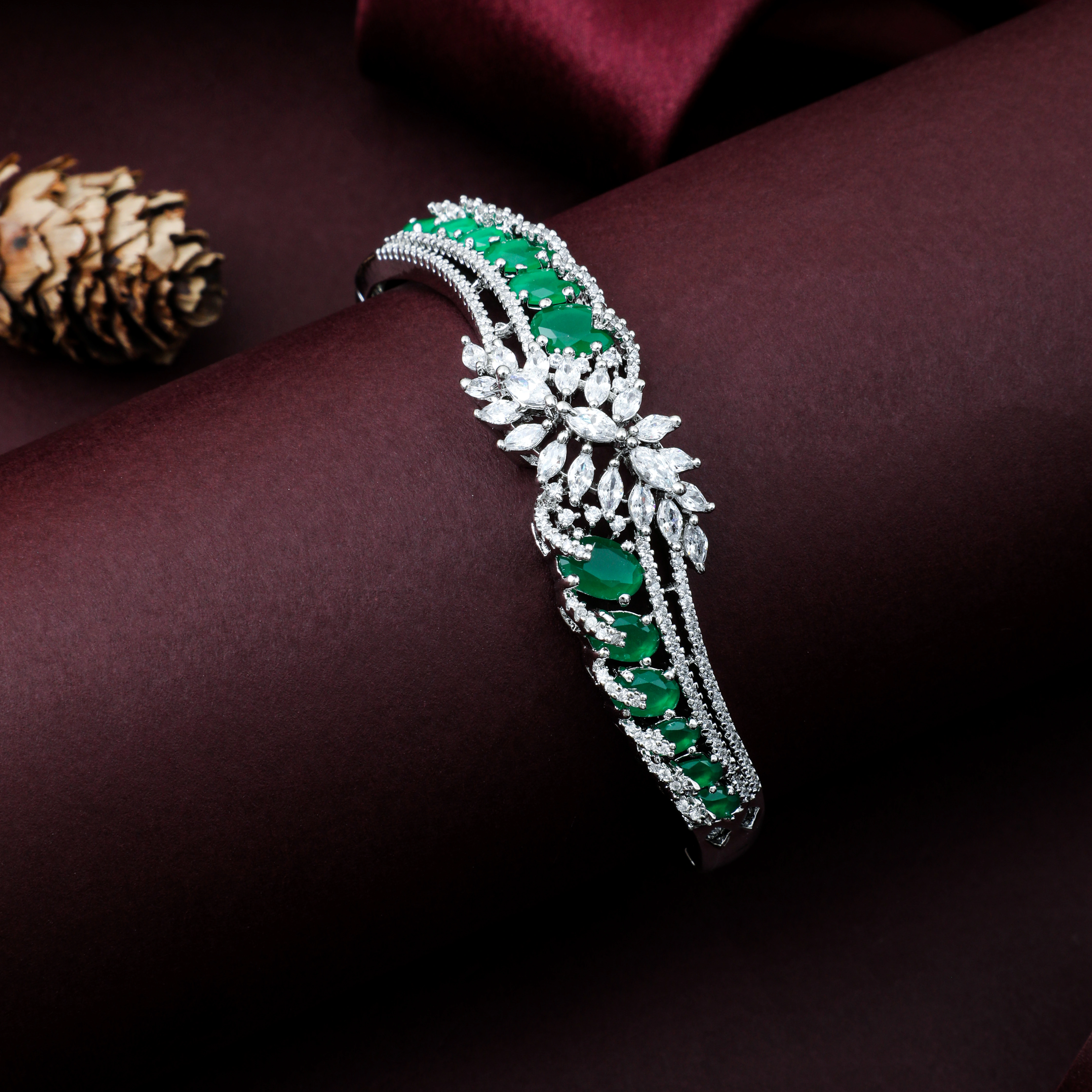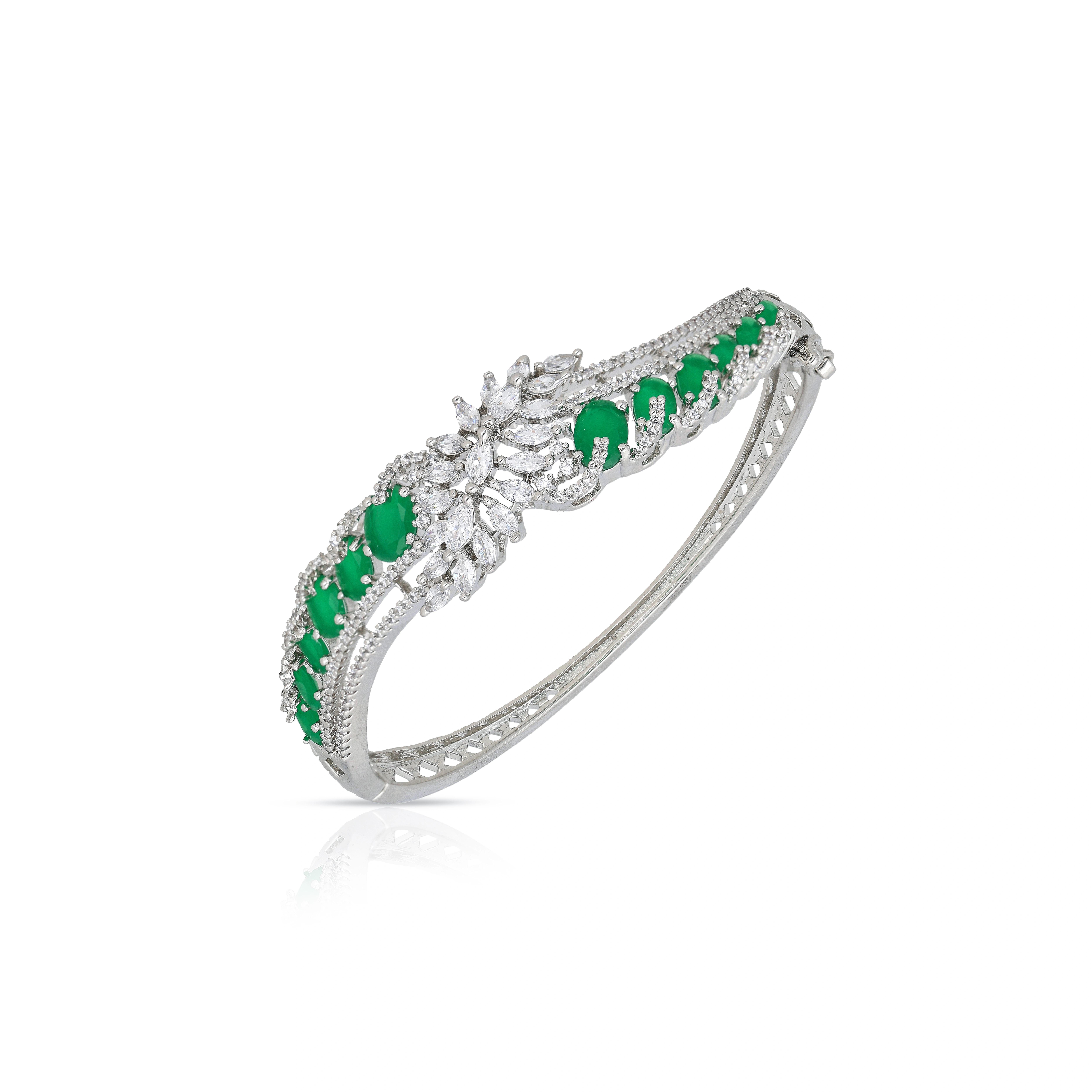 Crafted Silver Plated Bracelet With Cuff Design With Green Emerald Stone Studded For Womens