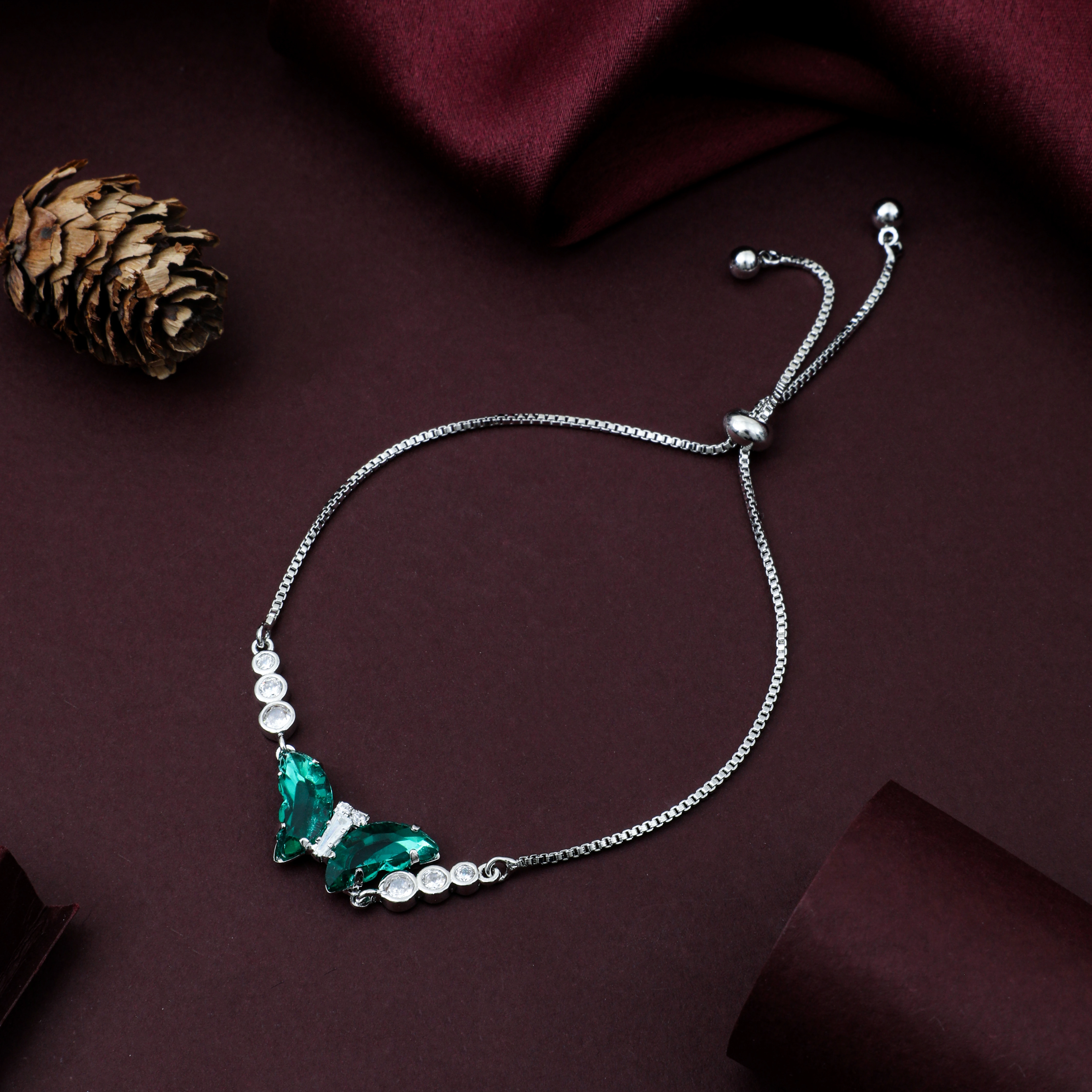 Crafted Silver Plated Bracelet With Green Emerald Butterfly Design Stone Studded For Womens