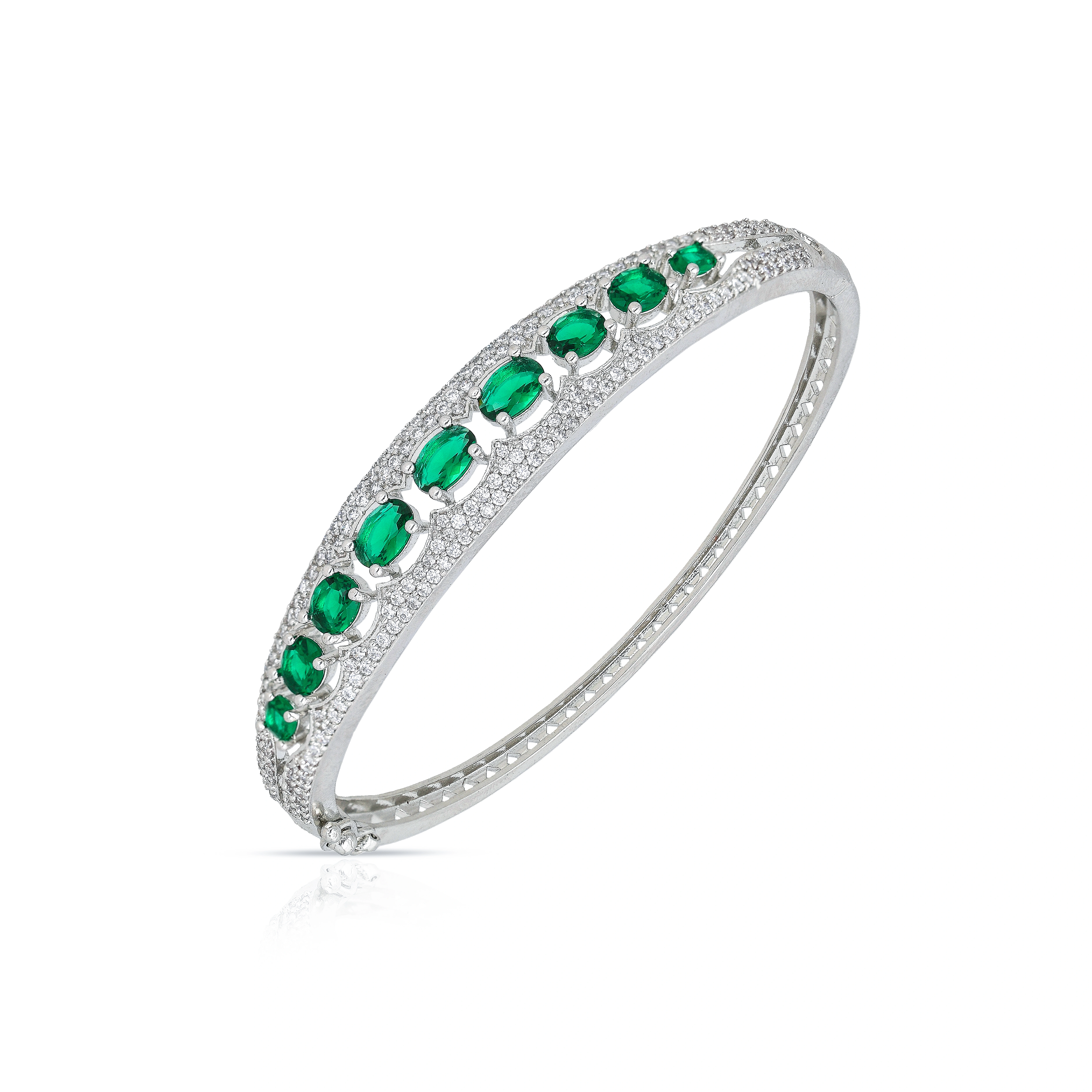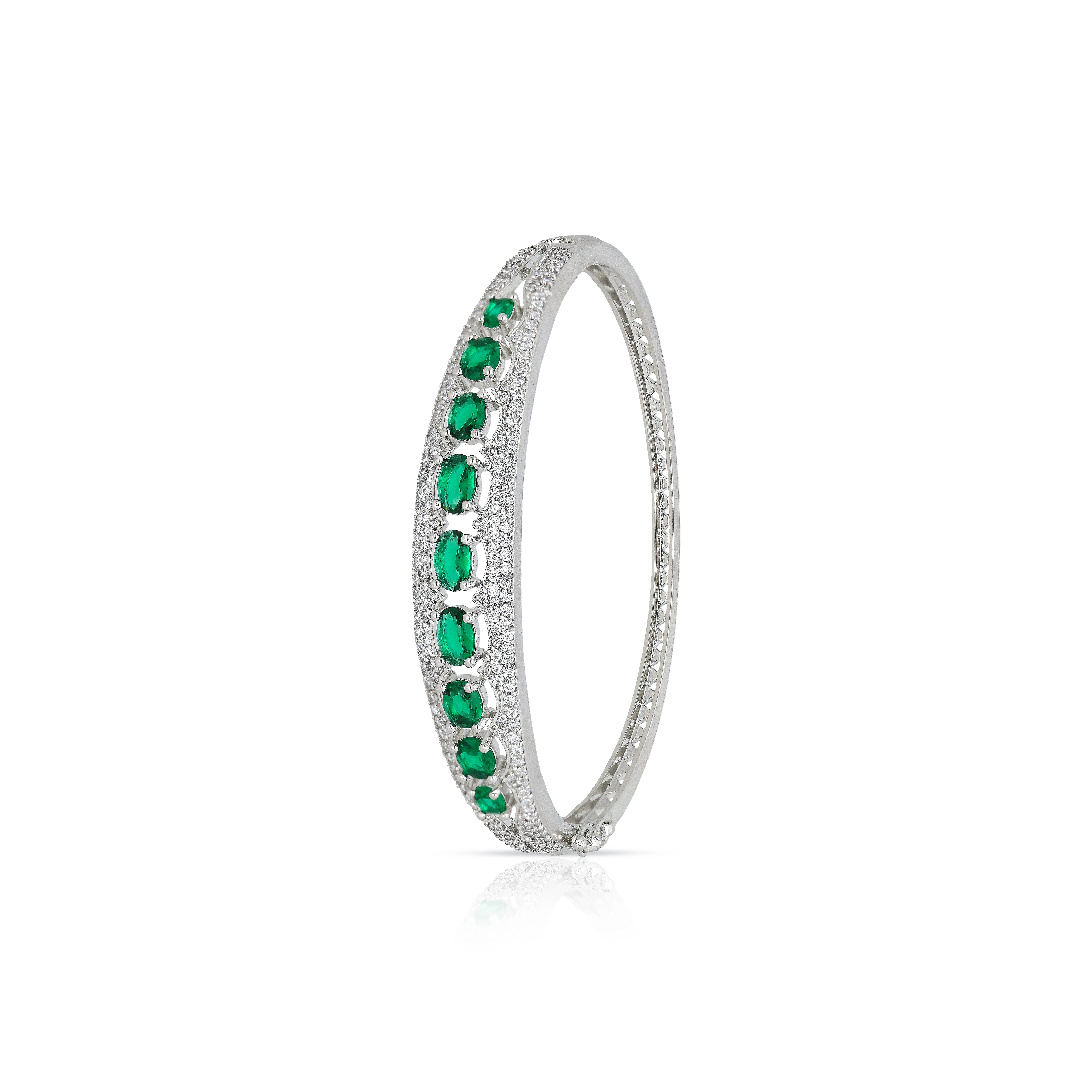 Crafted Silver Plated Bracelet With Green Emerald & White Stone Studded Design For Womens