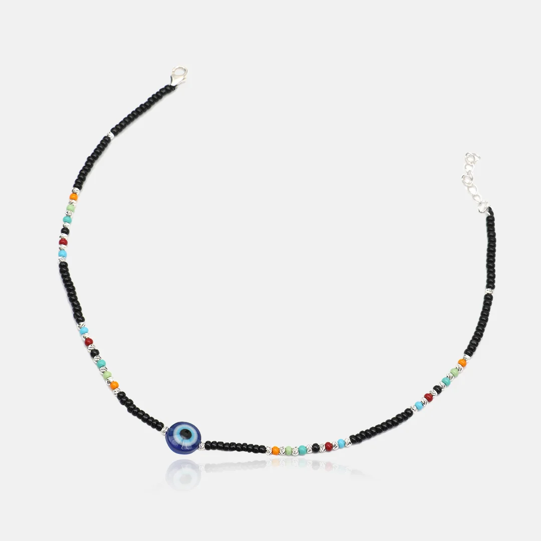 Pure Silver 925 Anklet With Black & Colourful Beads With Evil Eye For Women’s