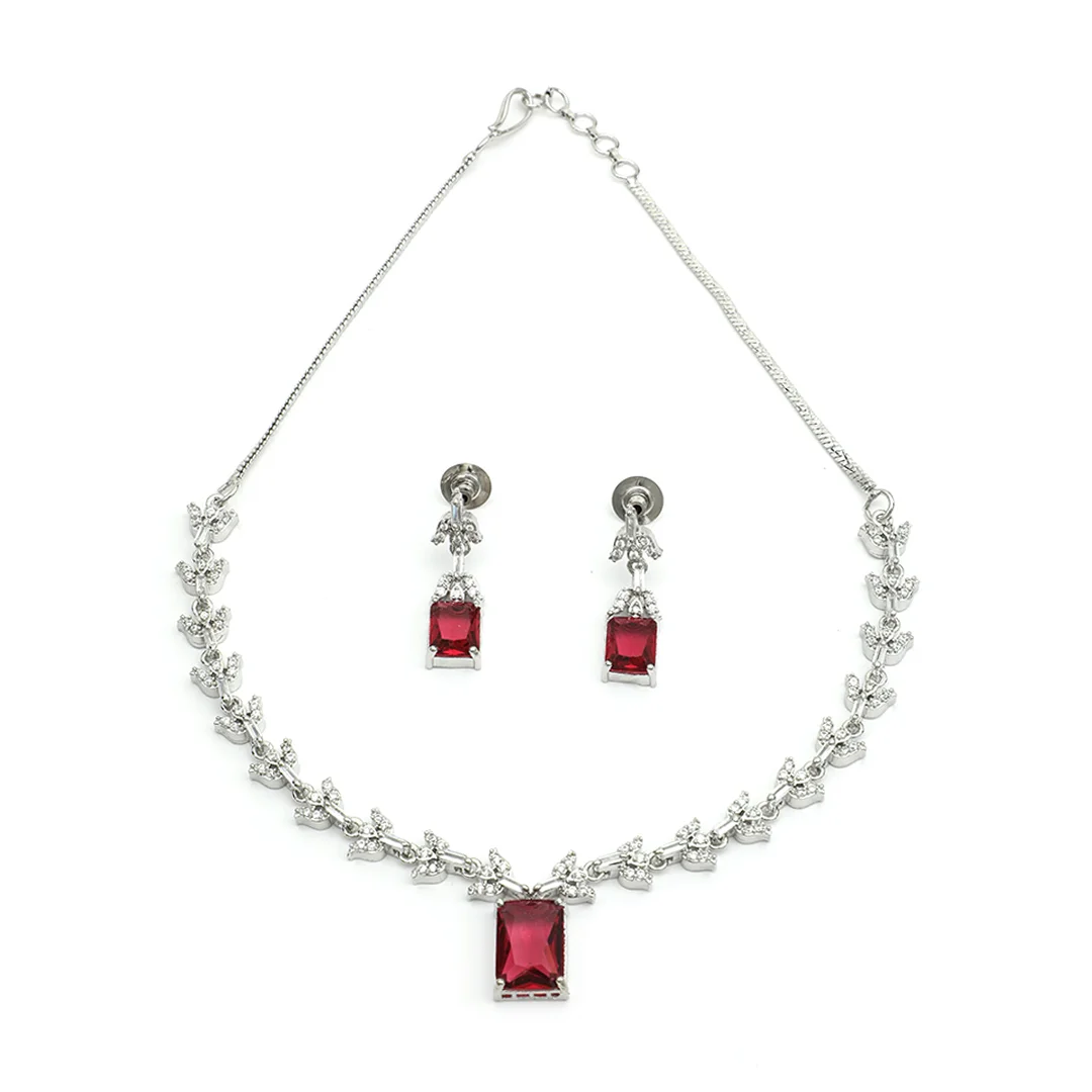 Silver Crafted Necklace Earring & Mix Of White Central Maroon Stone Set For Women’s