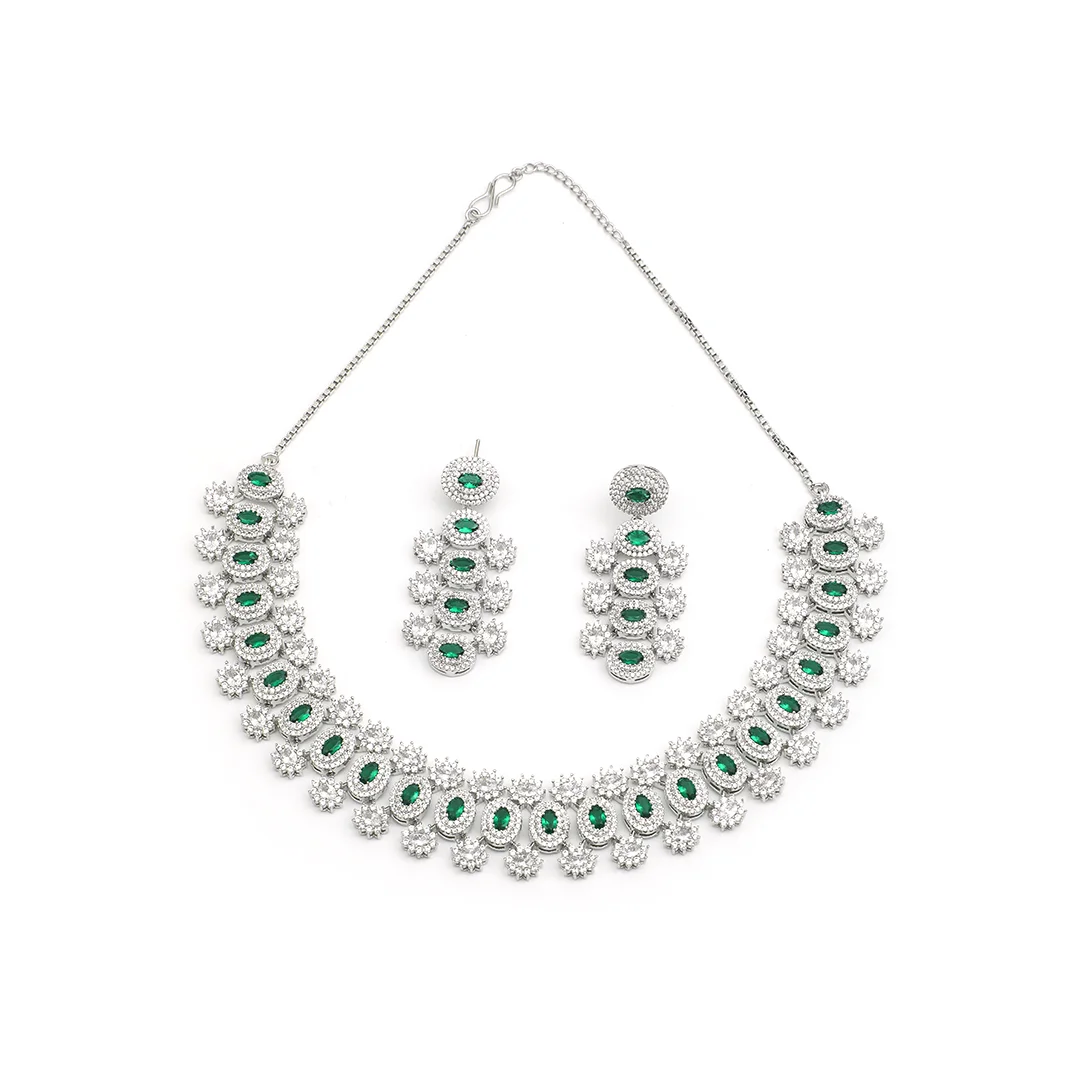 Silver Crafted Necklace Earring & Multi Green CZ Stone Studded Set For Women’s