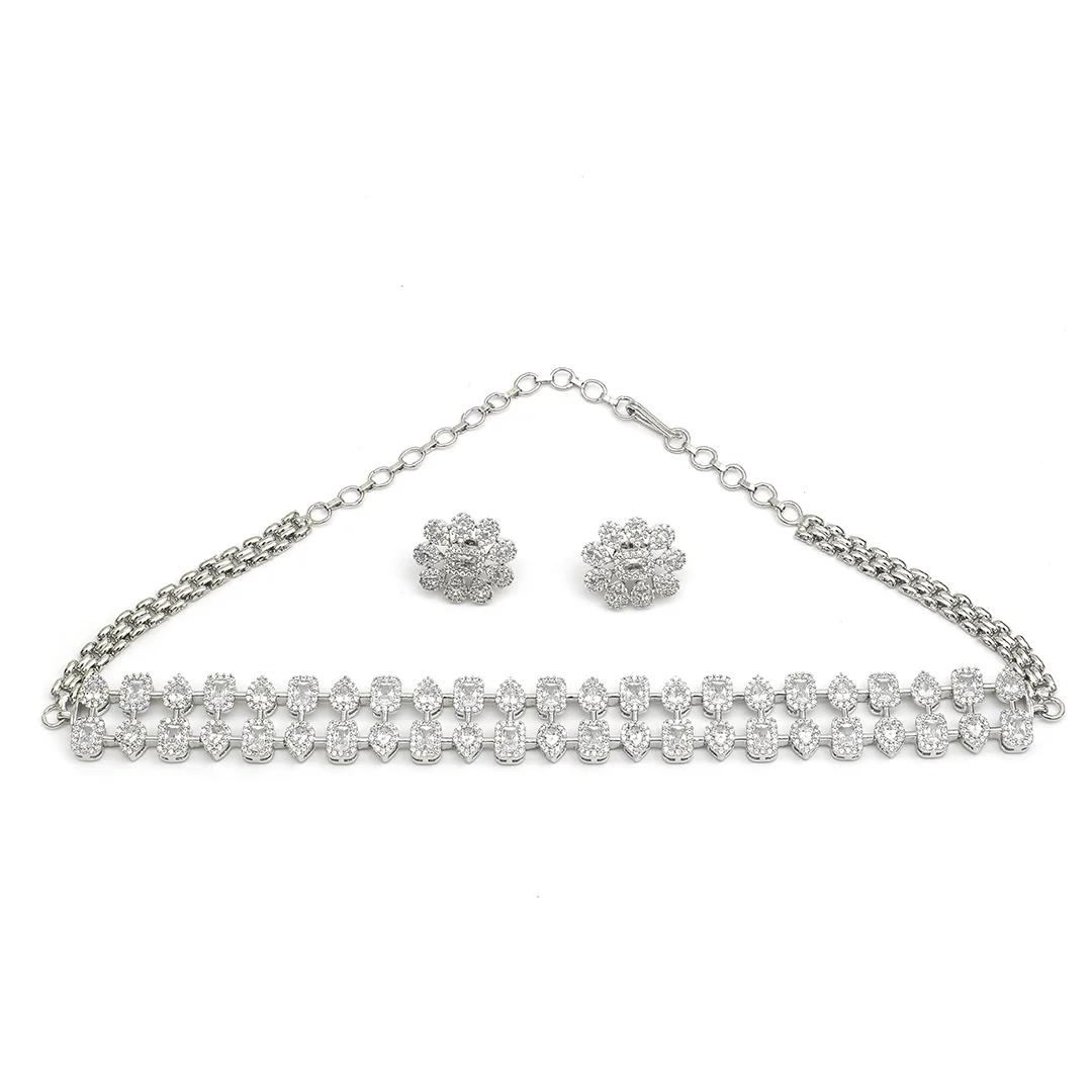 Silver Crafted Necklace Earring & Multi White Stones Choker Set For Women’s